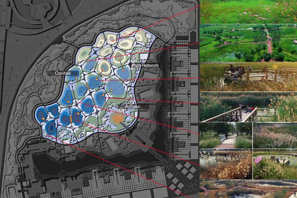 該地區(qū)一度有著濕地、鹽沼景觀,但因城市發(fā)展和基礎設施建設而消失殆盡。開挖的21個大小深淺不一的坑洞——直徑幅度從10~40米,鑿挖深度從0.5~2米——解決場地垃圾問題。由于雨季和地下水位淺的原因,這些坑洞或成為了水塘,或成為了濕地,或成為了季節(jié)性水池,或保持原狀成為一些無水的坑穴。