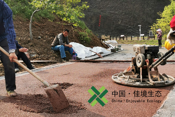 將定量石子,水泥,膠結劑,水投入攪拌均勻,鋪裝前用水濕潤路基,墊層需要振搗平整,面層用水泥抹平機收光抹平,施工后用農膜進行覆蓋養(yǎng)生兩天后灑水養(yǎng)護,時間約五到七天,期間應設隔離帶,避免行人通過,面層干燥后噴涂面層封閉劑(又稱面罩劑)。
