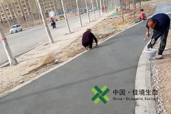 將定量石子,水泥,膠結(jié)劑,水投入攪拌均勻,鋪裝前用水濕潤路基,墊層需要振搗平整,面層用水泥抹平機收光抹平,施工后用農(nóng)膜進行覆蓋養(yǎng)生兩天后灑水養(yǎng)護,時間約五到七天,期間應(yīng)設(shè)隔離帶,避免行人通過,面層干燥后噴涂面層封閉劑(又稱面罩劑)。