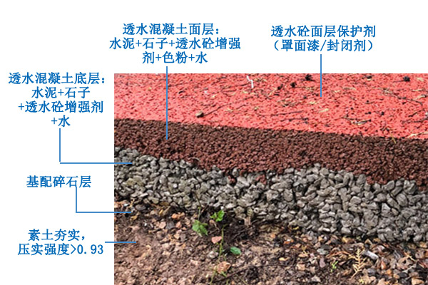 透水混凝土組成材料:水泥+石子+透水混凝土增強劑+水+透水混凝土罩面漆+色粉